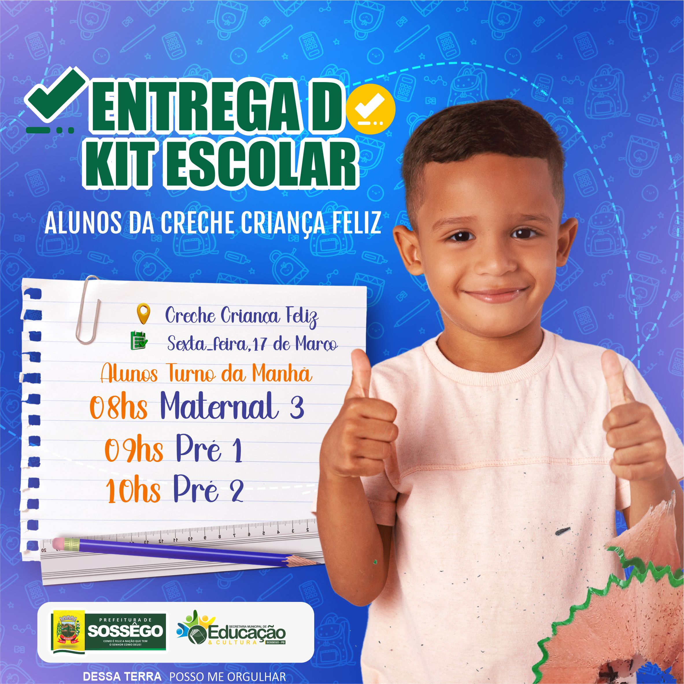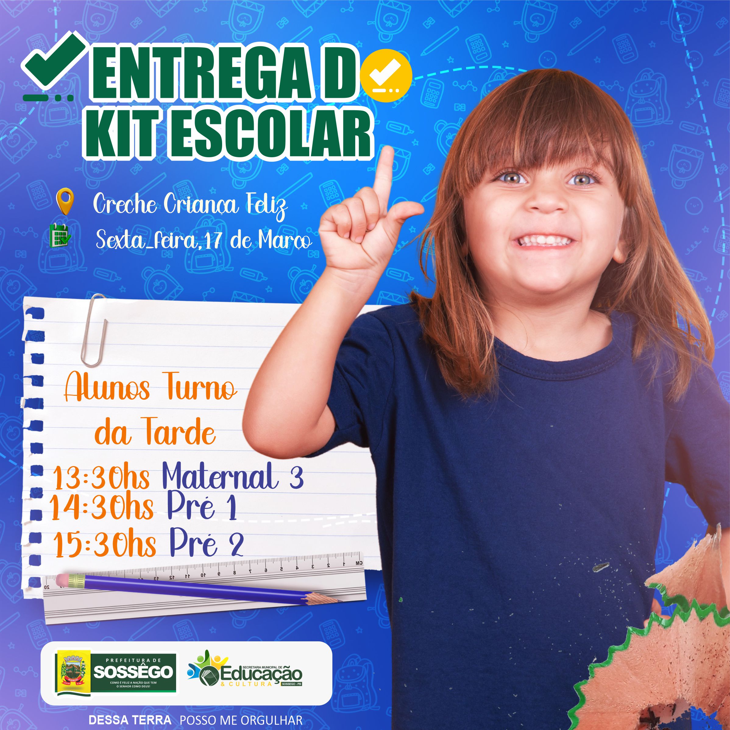 A Secretaria de Educação juntamente com a Creche Criança Feliz convida os pais ou responsáveis pelos alunos dessa instituição para a entrega dos kits escolares. Nesta sexta-feira na Creche Criança Feliz